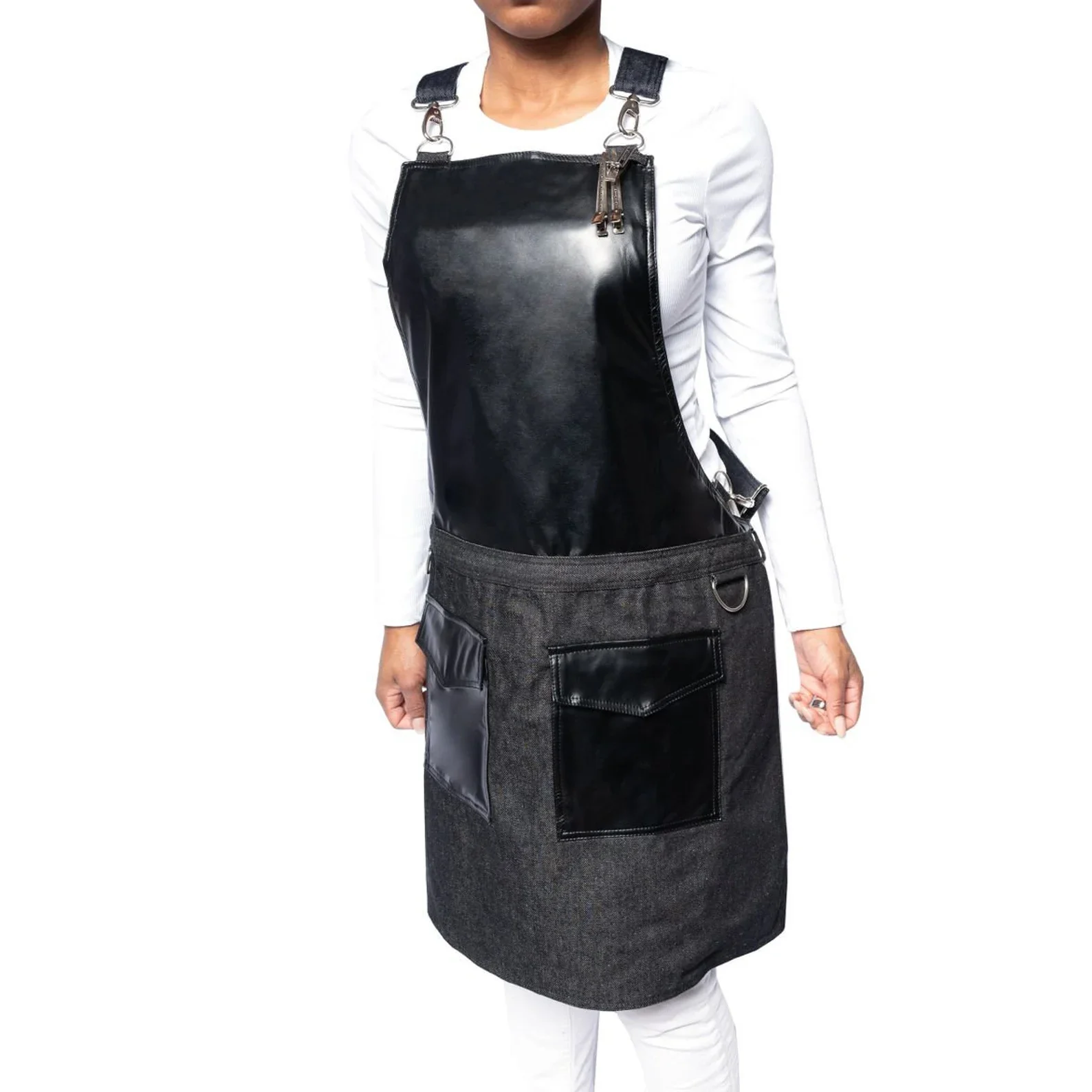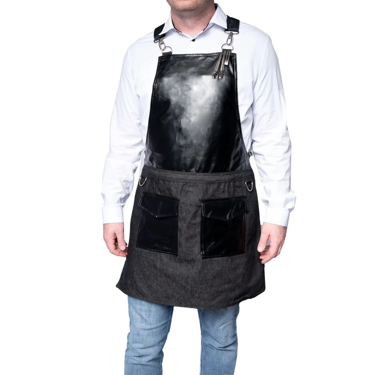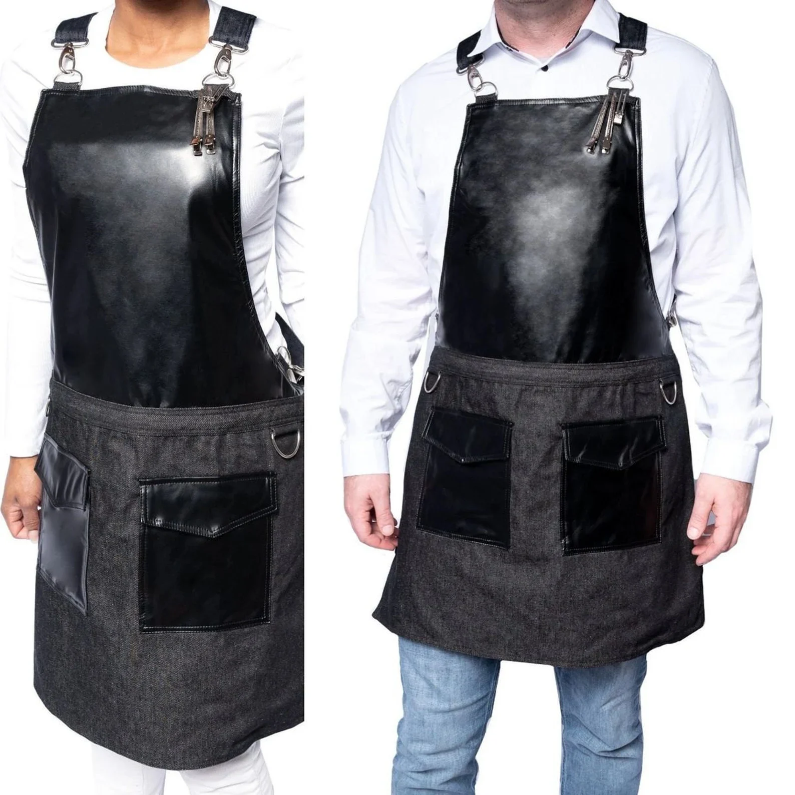 Short Water Proof Barber Hair Stylist Multi-purpose Crossback Black Jean Apron With Pockets (Petite)